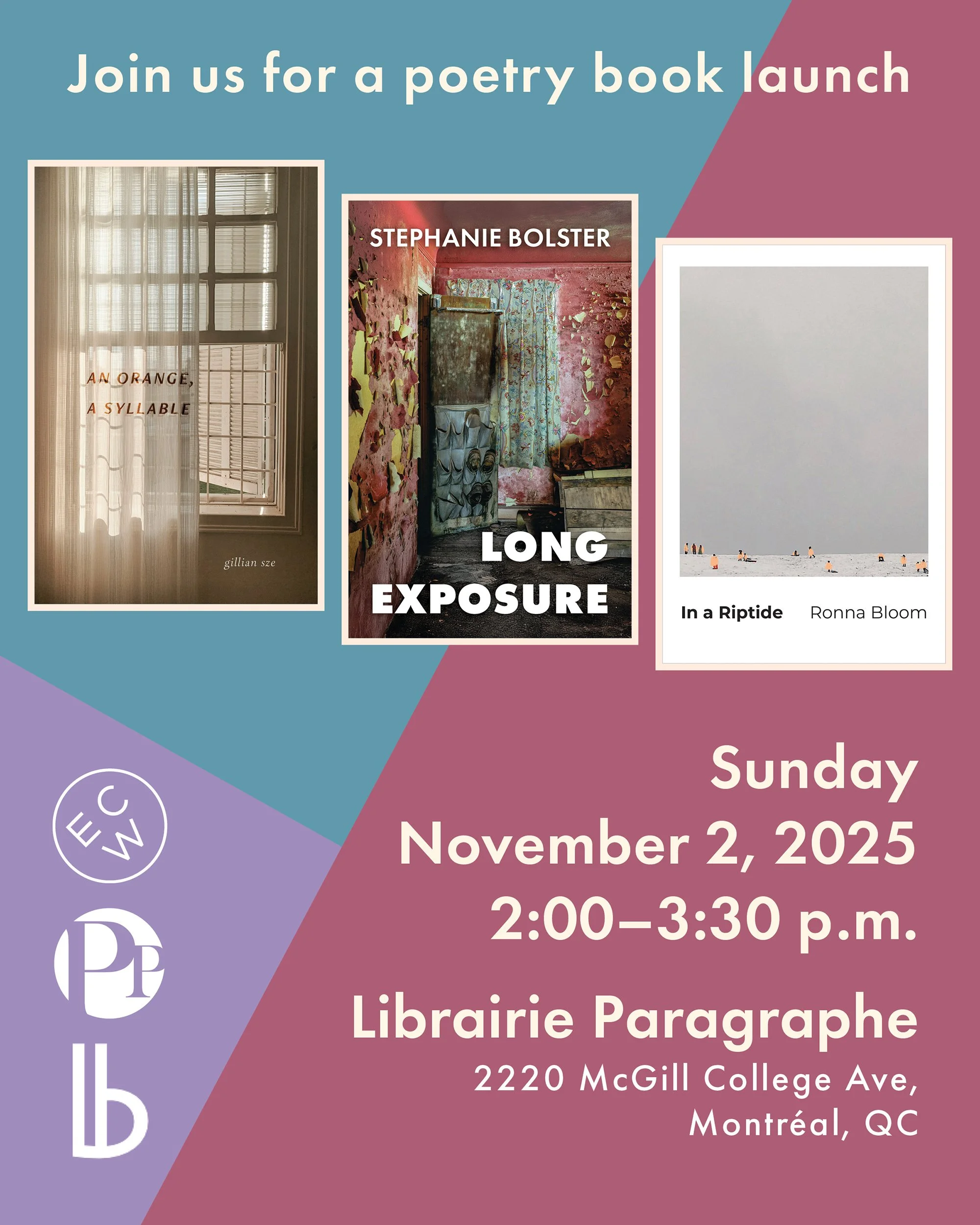 I am so thrilled to be joining Stephanie Bolster and Gillian Sze as we launch our books from Paragraphe Bookstore in Montreal. Please come and help us celebrate in this epic triple bill!